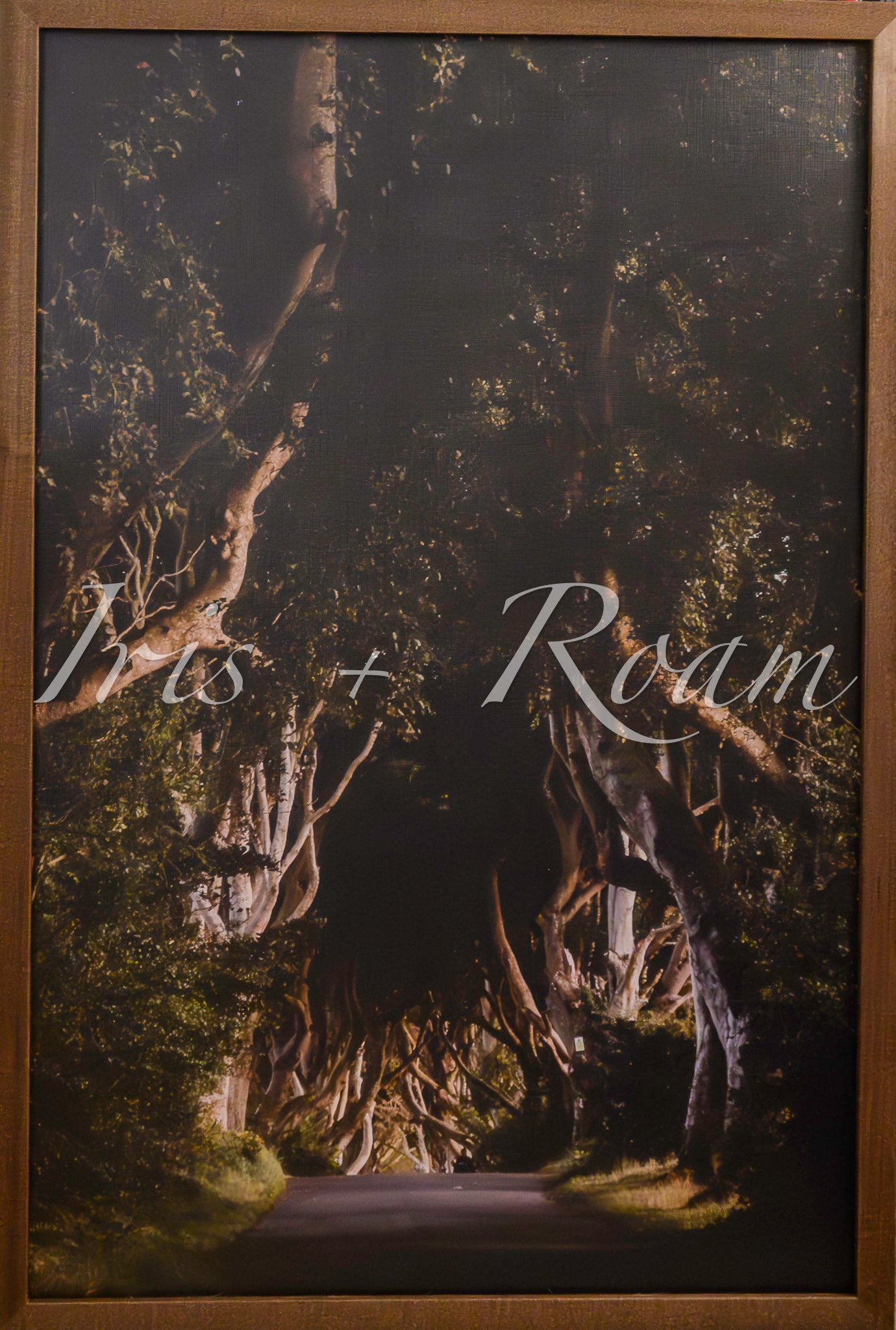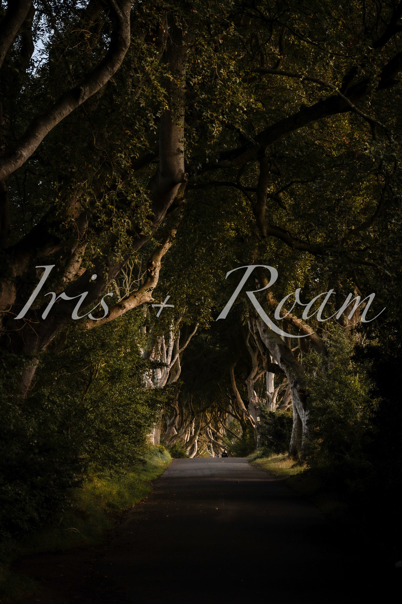 The warm golden light filters through the intertwined canopy of the Dark Hedges, creating elongated shadows along the tranquil country road. The ancient beech trees, with their twisted and leaning forms, resemble scenes from a lost fairytale, their rugged branches illuminated by the amber glow of the setting sun. It evokes the sensation of entering a tale on the verge of unfolding.