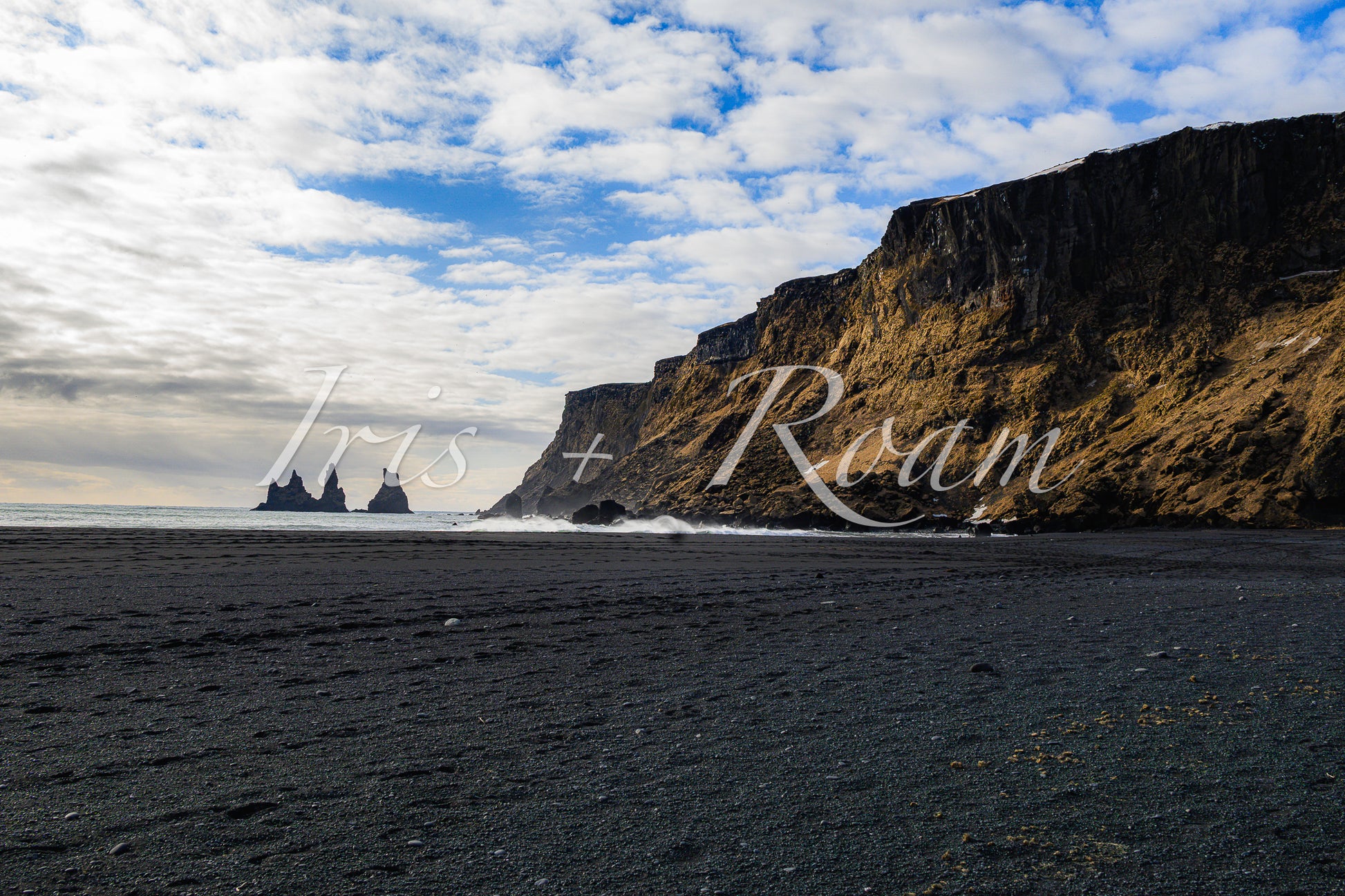 At Vik’s Ocean Edge, the black sands stretch wide beneath an ever-moving sky, meeting the relentless waves of the North Atlantic. In the distance, the Reynisdrangar sea stacks rise as silent sentinels, their presence felt but just beyond view. This landscape is a raw, elemental meeting of earth and sea—a timeless moment on Iceland’s rugged southern coast.