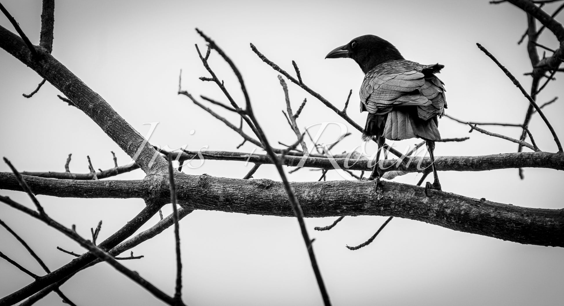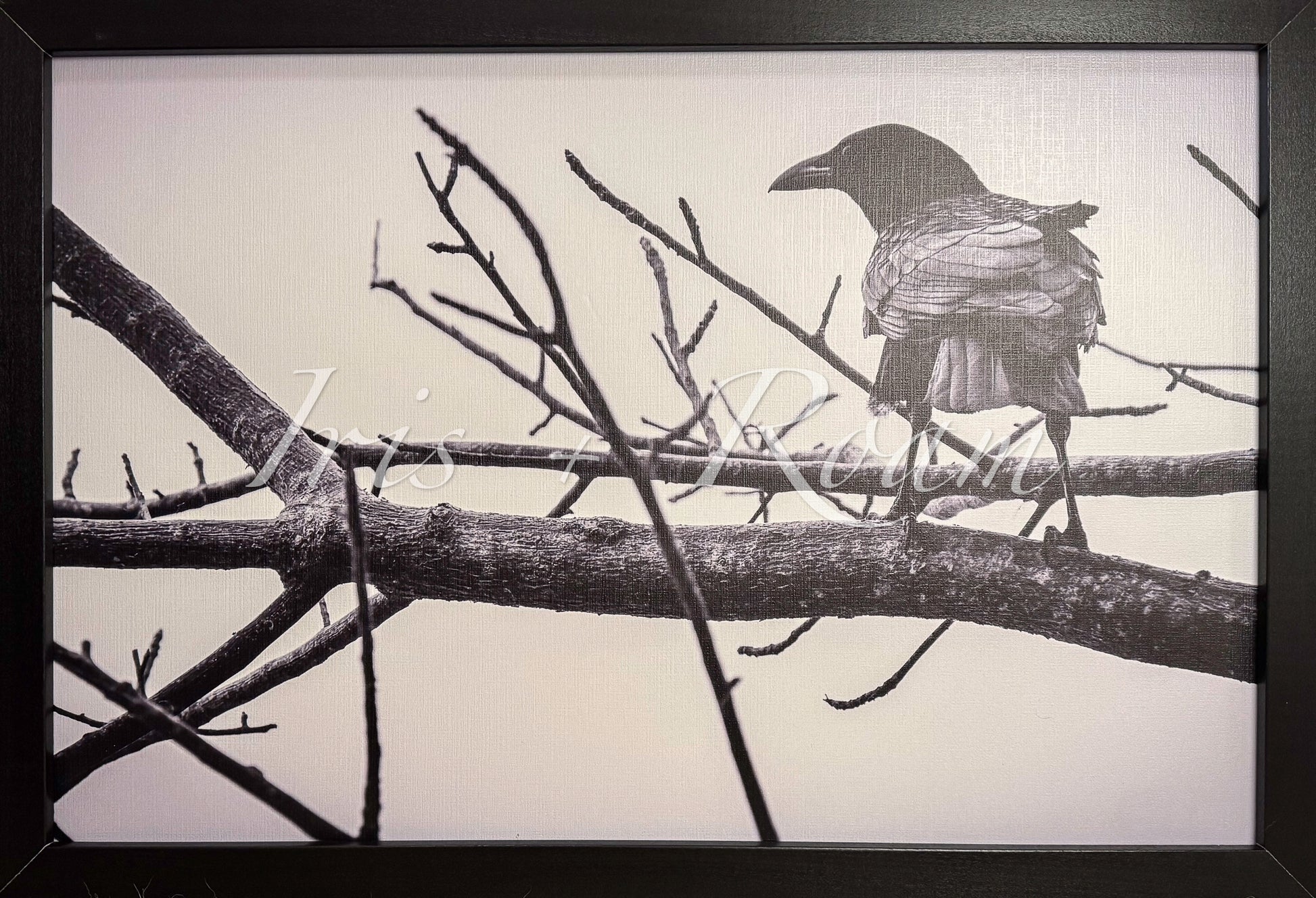 In this stark black-and-white moment, the corvid sits poised and still, its dark form sharply defined against the pale background. The simplicity of the bare branch and the absence of color draw focus to the bird’s quiet strength and presence. There’s a calm intensity in its gaze, a silent story told through shadow and light. This image captures the essence of wild solitude—a pause in time where nature’s elegance speaks volumes without a single sound.