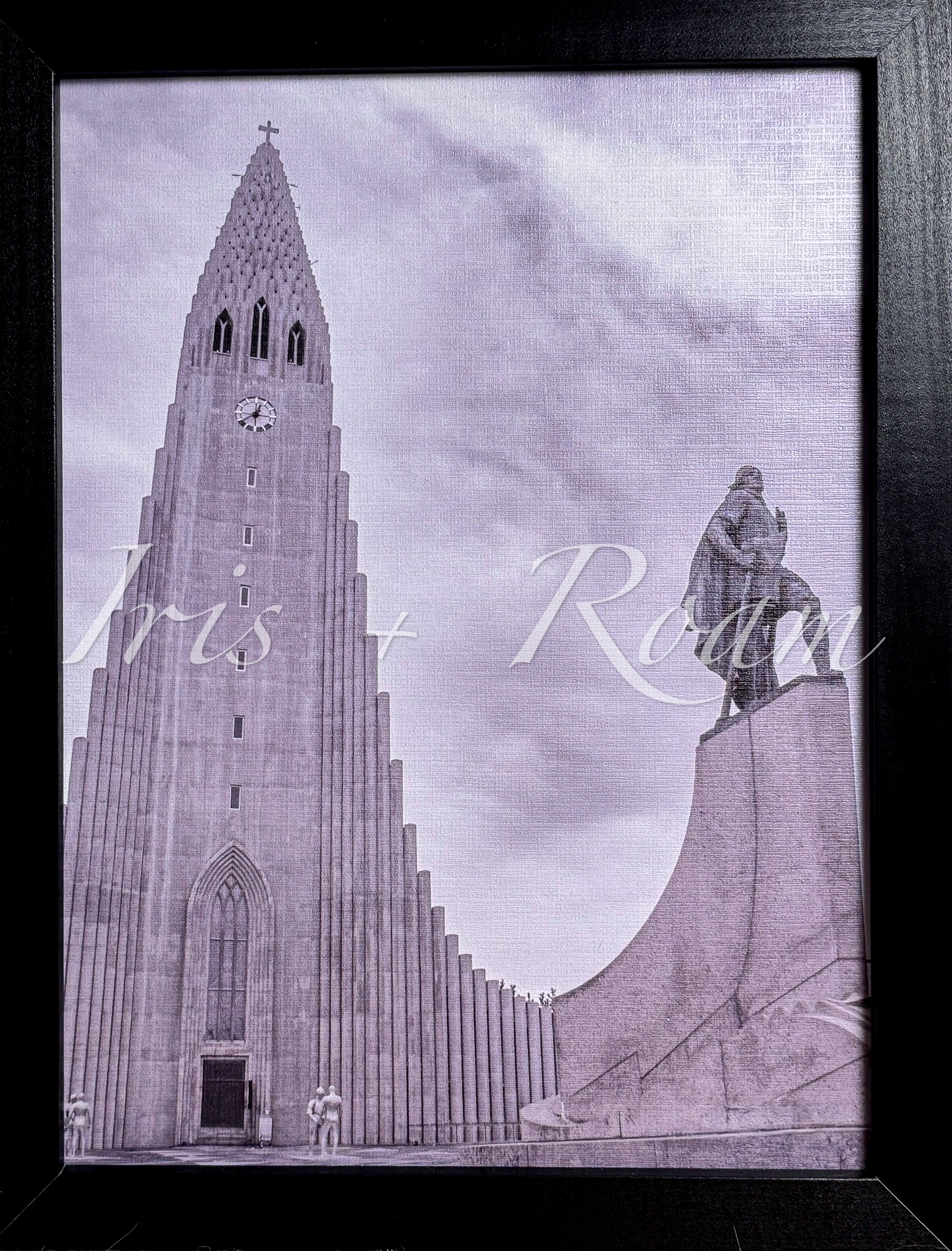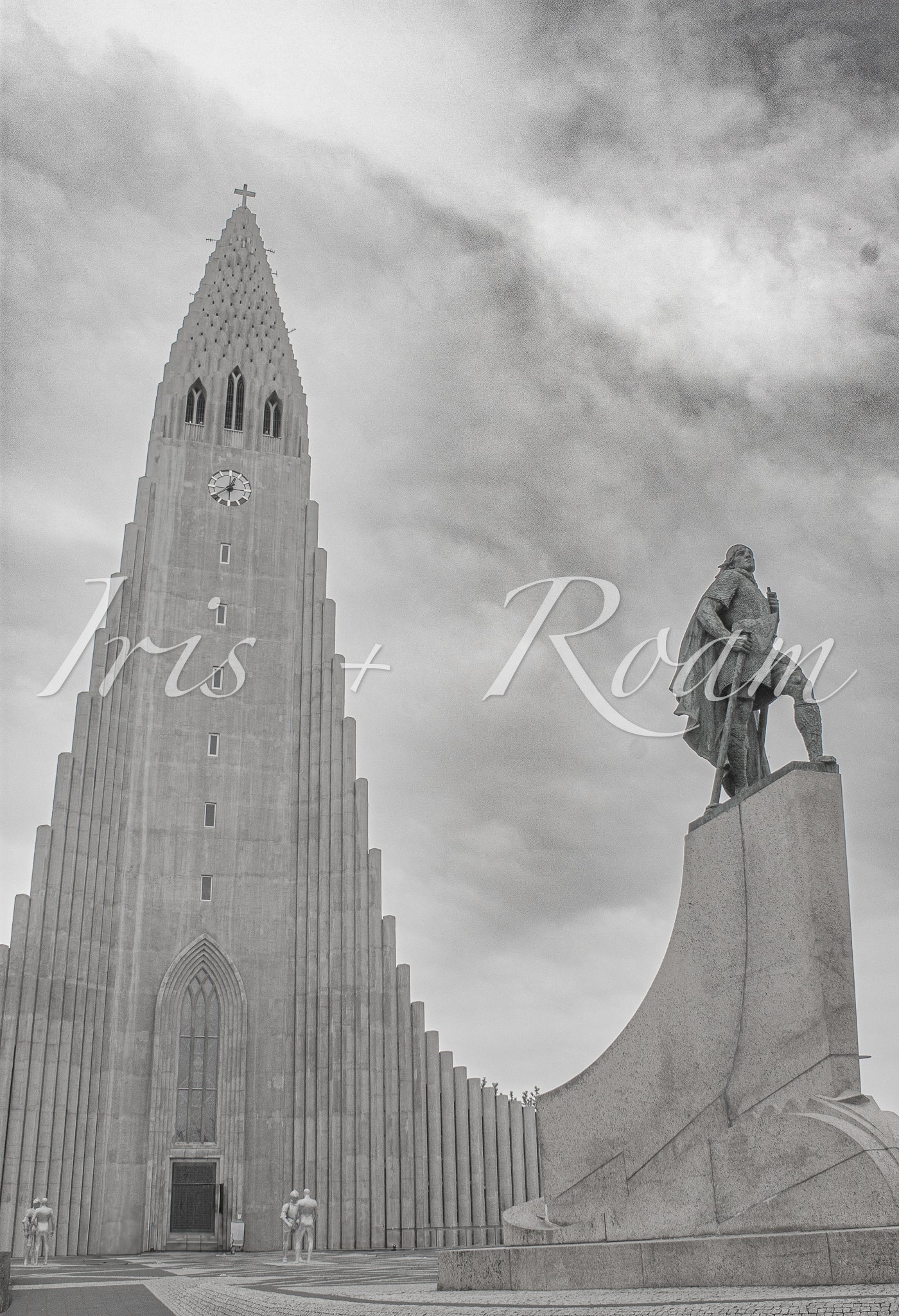 In stark black and white, Hallgrímskirkja rises like a basalt cathedral of Iceland’s soul, its jagged silhouette mirroring the volcanic cliffs that shaped this island. Before it stands Leif Erikson, cast in bronze and shadow, gazing outward as if still bound for unknown shores. Together, they embody a quiet collision of faith and folklore—timeless, weatherworn, and resolute against the northern sky.